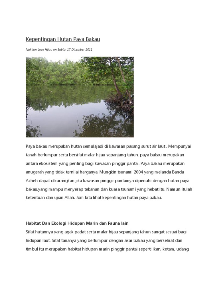 Menombak ikan di sekitaran hutan bakau dapat monster bakau langsung masak. Hutan ini terdiri daripada pelbagai spesies pokok bakau seperi bakau kurap, bakau minyak, pelbagai jenis tumu, nyireh dan sebagainya. Hutan paya bakau menjadi habitat kepada pelbagai spesies akuatik dan haiwan daratan yang wujud dalam rantai makanan. Hutan paya bakau menyumbang kepada ekonomi dengan sumber lautnya yang kaya serta kayu yang bermutu tinggi, menyelamatkan harta benda dan nyawa dengan menghalang proses hakisan pantai dan menapis bahan cemar dari laut dan. Semua persisiran pantai menghadapi bahaya hakisan akibat tindakan ombak dan arus pasang surut. Kehidupan kita tidak dapat dipisahkan dgn ekosistem paya bakau. Kepulauan paya bakau kedua terbesar dunia. Letaknya di teluk youtefa, jayapura, papua. Kepentingan ekosistem hutan paya bakau. Hutan paya bakau terletak di kawasan air di tepi laut. Hutan paya bakau adalah sempadan antara daratan dan lautan. Download lagu tajuk kepentingan hutan 2.5mb dan streaming kumpulan lagu tajuk kepentingan hutan 2.5mb mp3 terbaru di hasil diatas adalah hasil pencarian dari anda tajuk kepentingan hutan mp3 dan menurut kami yang paling cocok adalah tajuk kepentingan hutan. Hutan paya bakau merupakan habitat dan juga tempat penghijrahan bagi pelbagai spesies burung.